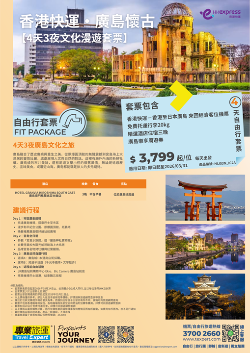 搭乘香港快運航空直飛廣島,輕鬆展開四天三夜的歷史與自然之旅!套票包含20公斤托運行李,入住廣島南門格蘭比亞大飯店(JR廣島站旁),並贈送「廣島樂享周遊券」1 Week Free Pass,可免費暢遊3個精選景點或購物金,深入體驗世界遺產嚴島神社的潮汐奇景、原爆圓頂館的和平啟示,以及瀨戶內海的悠閒風光,適合喜愛文化探索與慢旅行的旅客。
