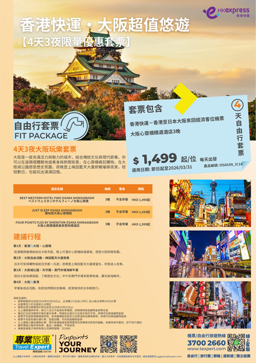 搭乘香港快運直飛日本大阪,輕鬆展開你的關西快閃之旅!本套票主打高性價比與自由彈性,機票與住宿一次搞定,讓你以最實惠的價格入住心齋橋精選酒店,無論購物、美食或交通都極為便利,是想省錢又想玩得盡興旅客的最佳選擇