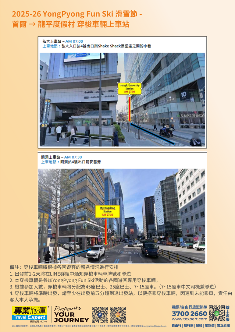 007:00 弘大車站上車 / 07:30 明洞車站上車 (車輛將準時出發,請提前在乘車點等候, 若因遲到無法搭乘,責任由客人自行承擔。)