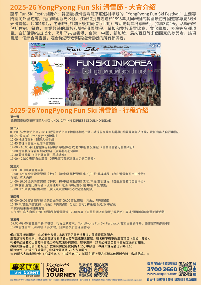 龍平 Fun Ski Festival簡介:韓國最初滑雪場龍平度假村舉辦的“YongPyong Fun Ski Festival”主要專門面向外國遊客,是由韓國觀光公社、江原特別自治道於1998年共同舉辦的韓國最初外國遊客專屬3晚4天滑雪營。(2004年起,老爺旅行社加入後共同進行活動)該活動每年冬季舉行,持續3晚4天,活動內容包括住宿、餐食、專業教練的單板和雙板滑雪課程、單板和雙板滑雪比賽、文化體驗、表演等多種項目。自該活動推出以來,吸引了來自香港、台灣、中國、新加坡、馬來西亞等多個國家的參與者。該項目是一個綜合滑雪營,適合從初學者到高級滑雪者的所有參與者。