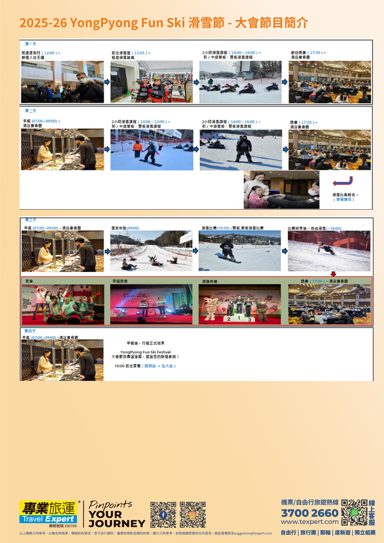※ 午餐:客人自理 16:00 歸還所有滑雪裝備 17:30 晚宴(五星級酒店自助餐 / 飲品吧)表演/頒獎典禮/幸運抽獎活動