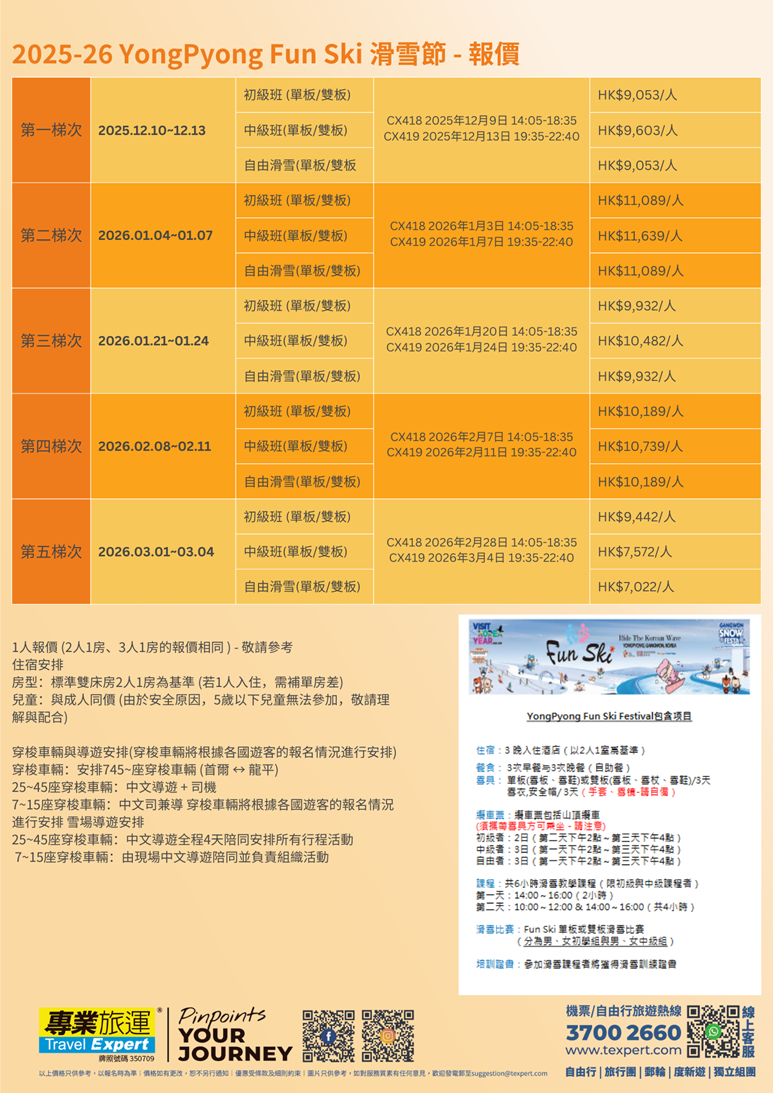 *備註: 1. 以上價錢以每位計算。 2. 預約時需提供: 客⼈全名、報名⼈數、歲數、特別要求及使⽤當地聯絡之通訊方法(WhatsApp/Line/WeChat)