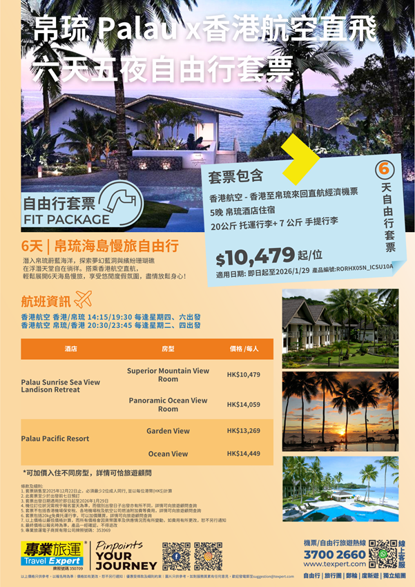 【帛琉】香港航空直飛X夢幻海島慢遊 6天5夜 自由行套票