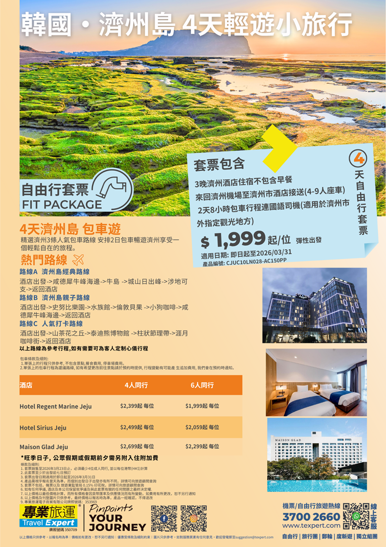 5. 套票不包括,機票以及 旅遊業監管局 0.15% 印花稅,詳情可向旅遊顧問查詢