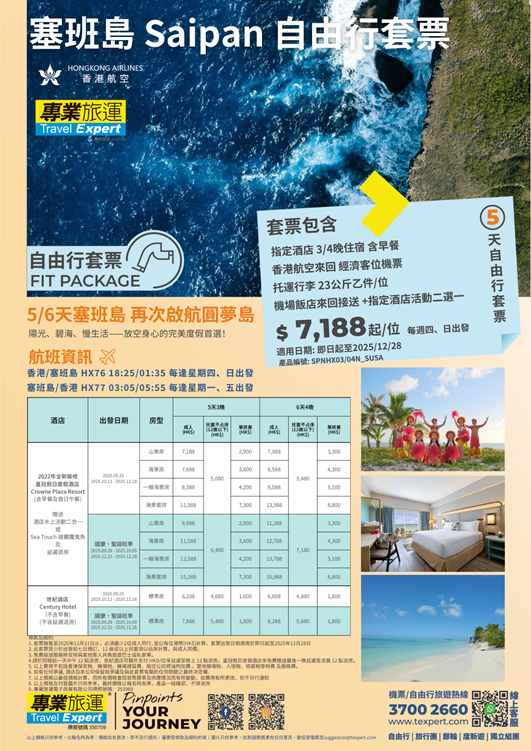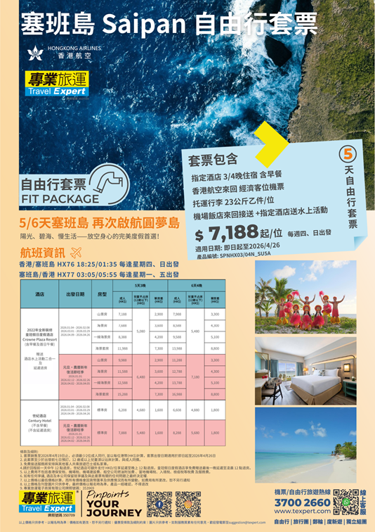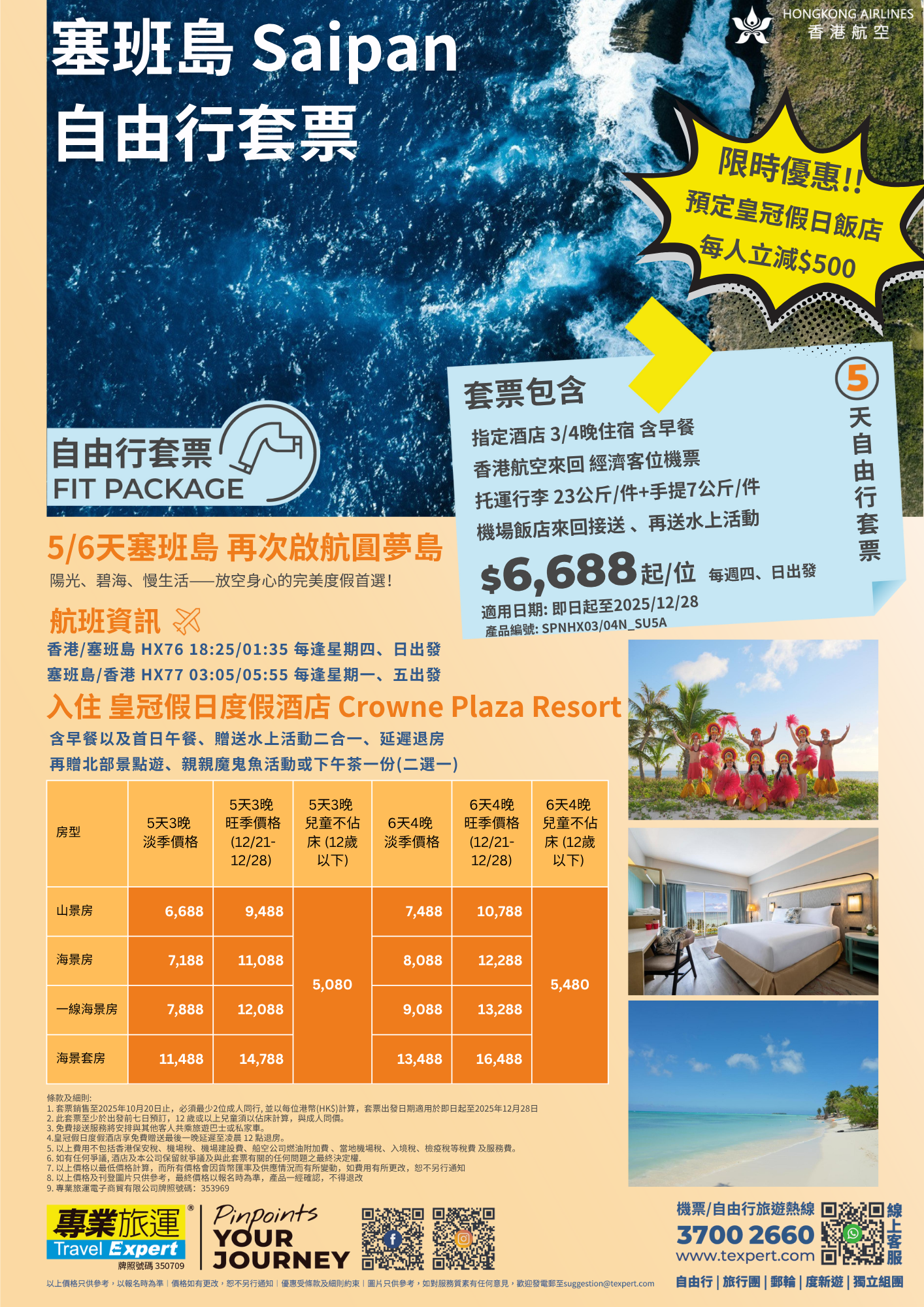 ★回程:HX77 塞班-香港03:05 / 05:55 ***只適用於逢星期一、五回程***