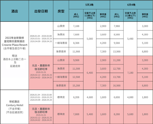 - 請於回程前一天中午 12 點退房,世紀酒店可額外支付 HKD 330/位享延遲至晚上 12 點退房。