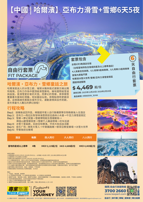 6.套票不包括各段機票及稅費、香港機場保安稅、各地機場稅及航空公司燃油附加費等費用,詳情可向旅遊顧問查詢