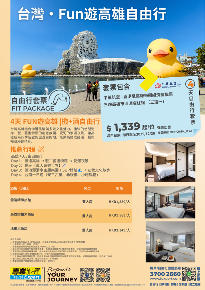 6. 套票包括1件 23KG 免費托運行李,詳情可向旅遊顧問查詢