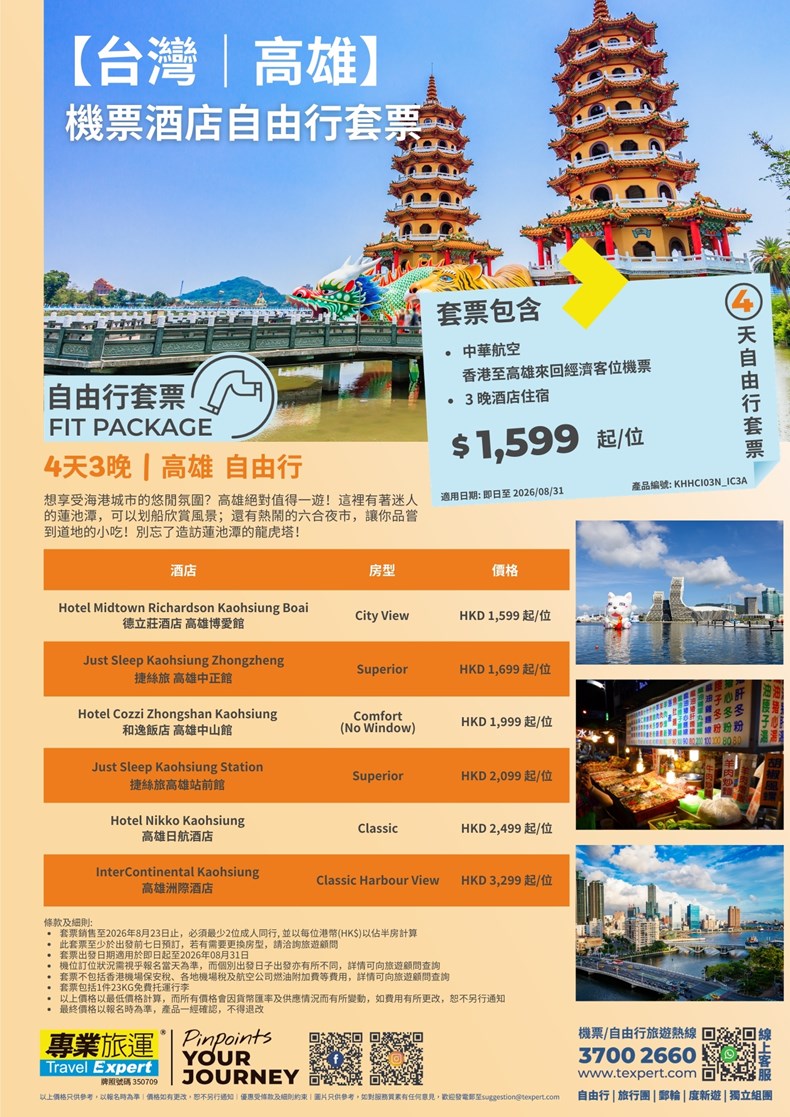- 套票不包括香港機場保安稅、各地機場稅及航空公司燃油附加費等費用,詳情可向旅遊顧問查詢