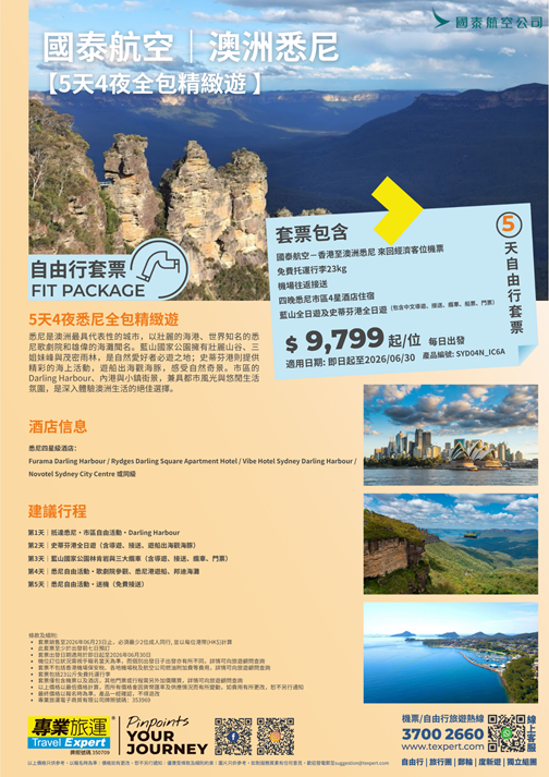 本產品為香港直飛悉尼五天四夜全包套票,含國泰航空來回經濟客位機票及23公斤免費托運行李,機場往返巴士接送,悉尼市區四晚4星酒店住宿,專業中文導遊全程陪同,帶您深入體驗悉尼及周邊自然美景,藍山三大纜車與史蒂芬港觀海豚遊船,輕鬆享受舒適小團遊,每團不超過12人,行程安排兼具深度與自由。