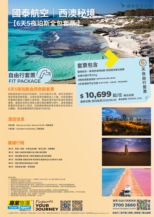 6天5夜珀斯全包套票,帶你從珀斯市區出發,探索西澳壯麗的自然景觀與海岸美景。行程包含尖峰石陣、粉紅湖、卡爾巴里國家公園、藍瑟林白沙丘4驅沖沙等經典景點,還有羅特尼斯島微笑小袋鼠自由行體驗,並贈送每位一次白沙丘沖沙的刺激活動。全程中文司兼導服務、五星級酒店住宿及全程景點門票,讓你輕鬆享受西澳的奇幻風光與獨特文化。