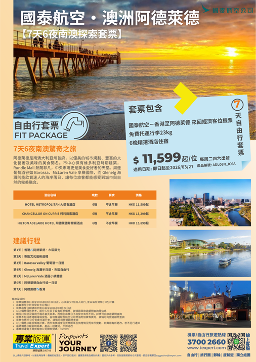期間限定套票提供香港直飛往返機票,並包含六晚精選市中心酒店住宿,讓您輕鬆探索阿德萊德市區、葡萄酒谷及沿海風光。旅客可自由安排市內景點和周邊一日遊行程,享受靈活的旅行節奏,無需擔心交通或住宿安排,特別適合想深度體驗南澳風情的旅客。