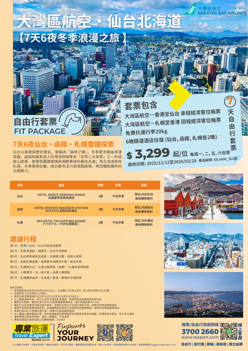 走進日本東北與北海道的銀白世界,從仙台出發一路北上,感受東北的文化底蘊與冬季魅力,再前往函館欣賞浪漫夜景,最後抵達札幌體驗雪國的都會氛圍。此行程融合城市漫遊、特色美食與北國冬景,帶您深入探索日本冬季最迷人的一面。