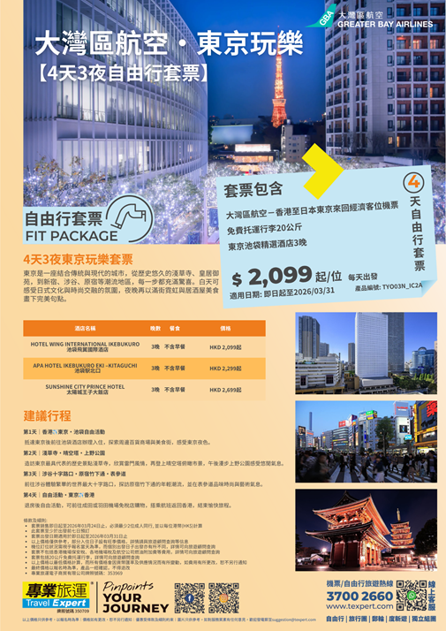 搭乘大灣區航空直飛東京,輕鬆展開你的日系假期!套票包含香港出發至東京的來回經濟客位機票,享受20公斤免費托運行李,再入住位於購物與交通樞紐的池袋精選酒店,讓你暢遊東京、購物美食兩不誤。