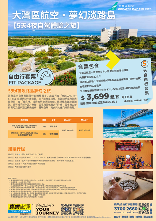 【大灣區航空|淡路夢幻五日】5天4夜自駕體驗之旅|HELLO KITTY SMILE・鳴門漩渦・淡路花彩敷 | 專業旅運 Travel Expert