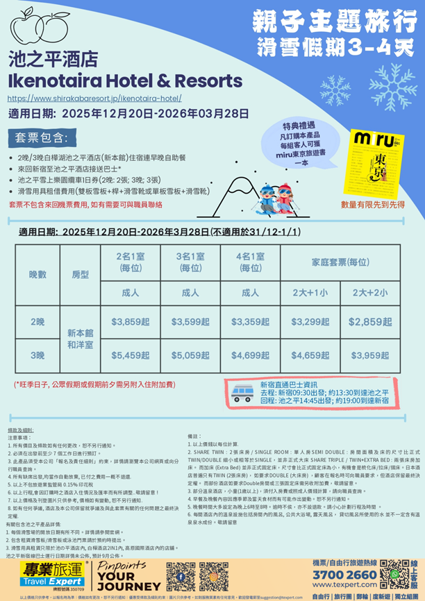 • 池之平雪上樂園纜⾞1⽇券(2晚: 2張; 3晚; 3張)