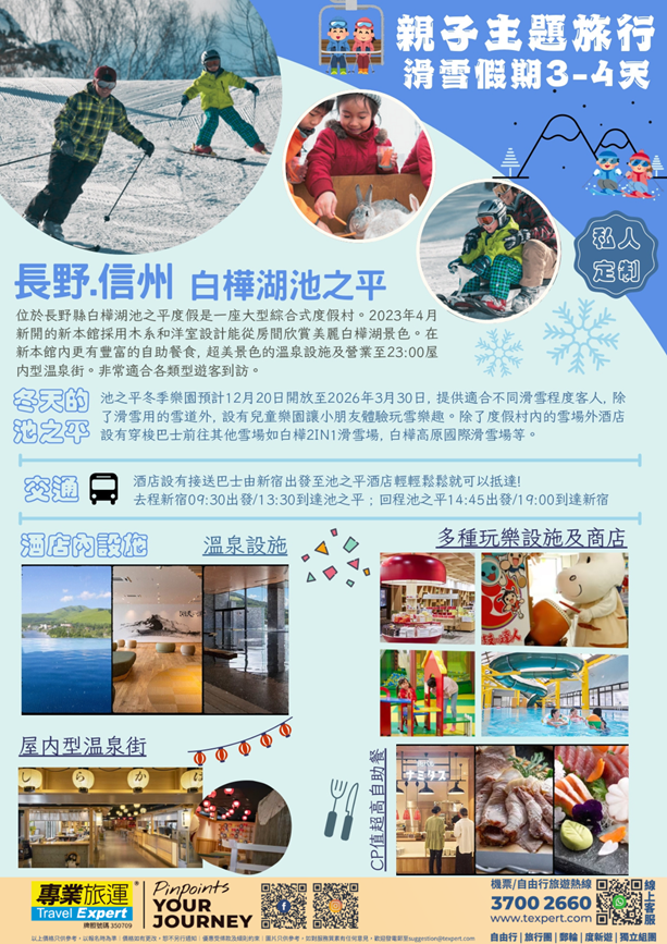 想體驗日本長野縣的冬日魅力?這個滑雪套票為你安排妥當!入住白樺湖池之平酒店(新本館),享受舒適住宿及豐富早晚自助餐,更包來回新宿接送,輕鬆往返。套票包含池之平雪上樂園纜車券(2晚送2張,3晚送3張),讓你盡情玩雪,同時提供滑雪用具租借(雙板或單板任選),無需額外準備裝備。無論是滑雪新手還是高手,都能暢玩長野的雪白世界!