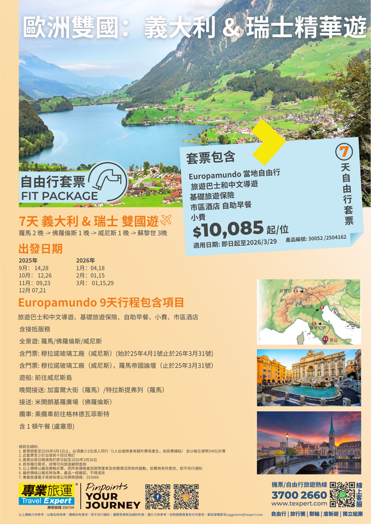 羅馬 2 晚 -> 佛羅倫斯 1 晚 -> 威尼斯 1 晚 -> 蘇黎世 3晚 義大利瑞士經典7天遊 一次走訪歐洲兩大浪漫國度!行程精選羅馬、佛羅倫斯、威尼斯三大藝術古城,感受文藝復興與浪漫水都風情;再前往瑞士盧塞恩、蘇黎世,欣賞湖光山色與阿爾卑斯美景。全程安排舒適住宿與專業導覽,讓您在7天內輕鬆暢遊義大利與瑞士的經典文化與自然風光。