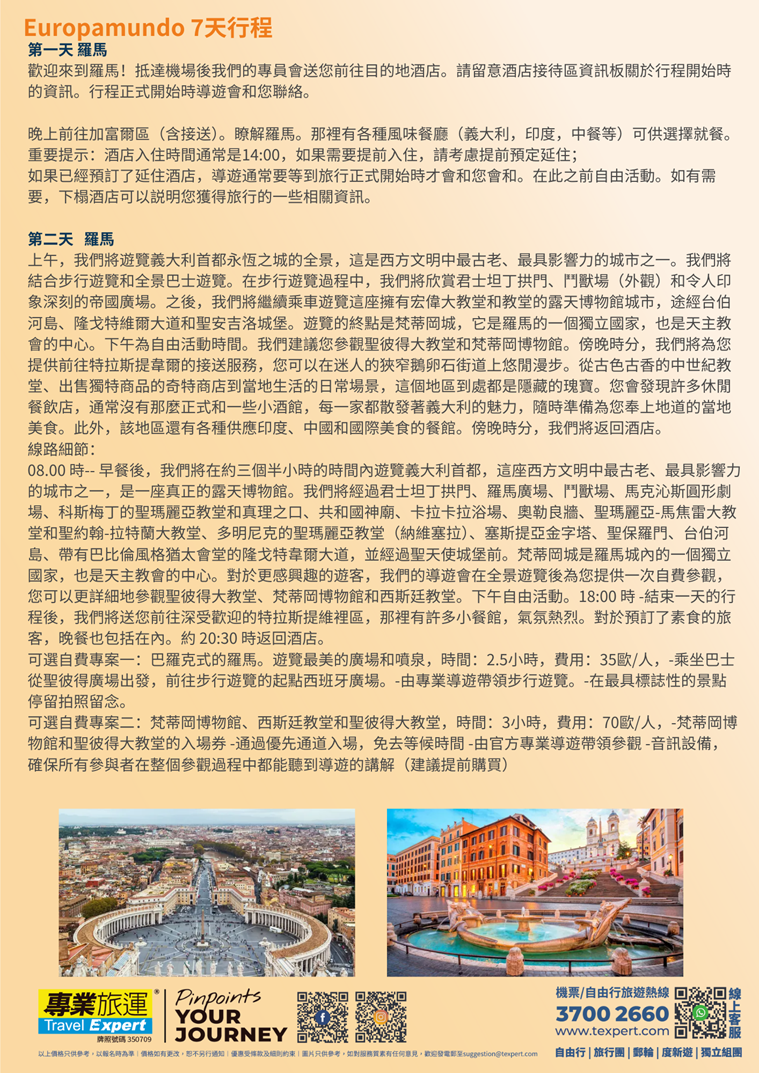 可選自費專案二:梵蒂岡博物館、西斯廷教堂和聖彼得大教堂,時間:3小時,費用:70歐/人,-梵蒂岡博物館和聖彼得大教堂的入場券 -通過優先通道入場,免去等候時間 -由官方專業導遊帶領參觀 -音訊設備,確保所有參與者在整個參觀過程中都能聽到導遊的講解(建議提前購買)