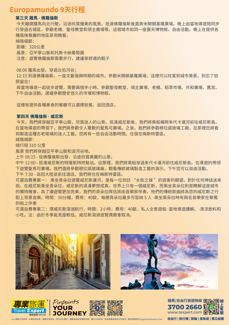 注意:遊覽佛羅倫斯需要步行,建議穿舒適的鞋子