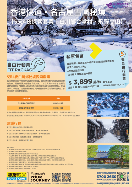 從香港直飛日本中部核心城市名古屋,輕鬆展開一段結合古韻與雪景的旅程。套票包含往返機票、20公斤托運行李、名古屋市中心酒店四晚住宿,並安排白川鄉與飛驒高山一日遊。旅客可盡情漫步於歷史街景中,感受濃濃日本傳統氛圍與冬季的浪漫雪景。