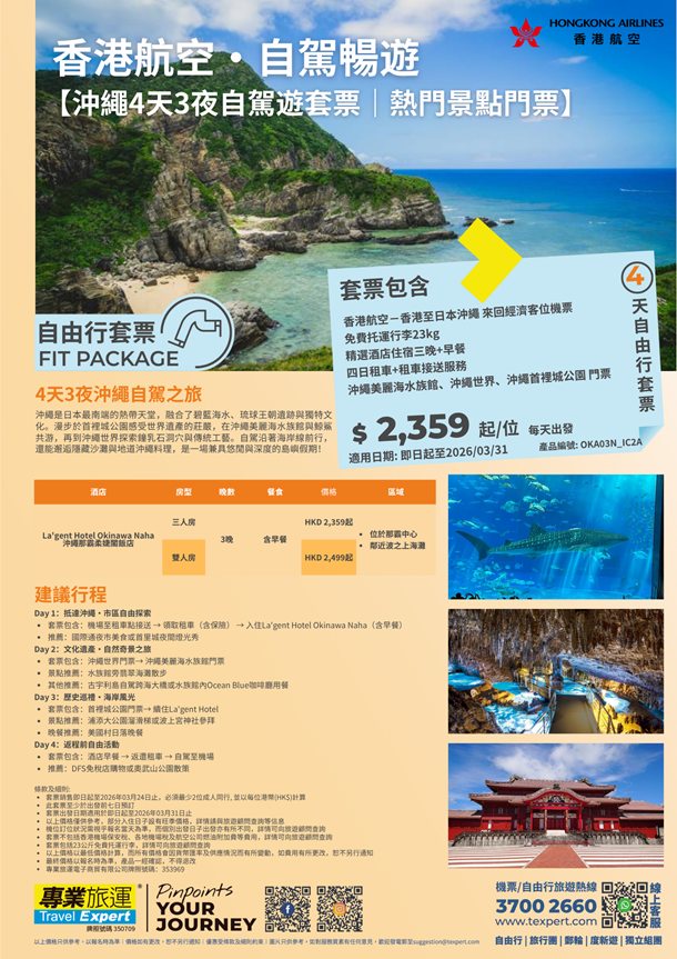 享受香港航空直飛沖繩的便捷,輕鬆展開4天3夜自駕之旅!套票包含23公斤托運行李、4日租車(含全險及NOC)及機場接送,入住那霸市區的La'gent Hotel Okinawa Naha,每日享用早餐,更贈送沖繩美麗海水族館、沖繩世界文化王國及首裡城公園三大景點門票,讓你自由探索沖繩的自然奇觀與琉球歷史,體驗自駕環島的樂趣!